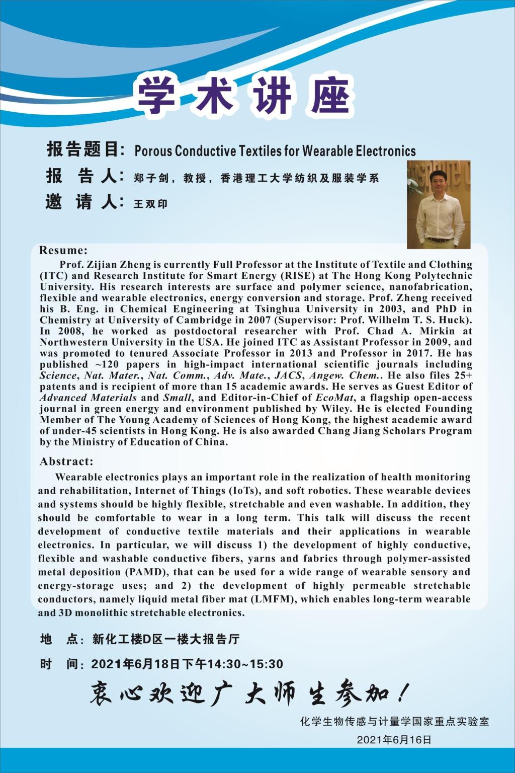 學(xué)術(shù)地點(diǎn) 新化工樓D區(qū)一樓大報(bào)告廳 主講人 鄭子劍 教授 香港理工大學(xué)紡織及服裝學(xué)系