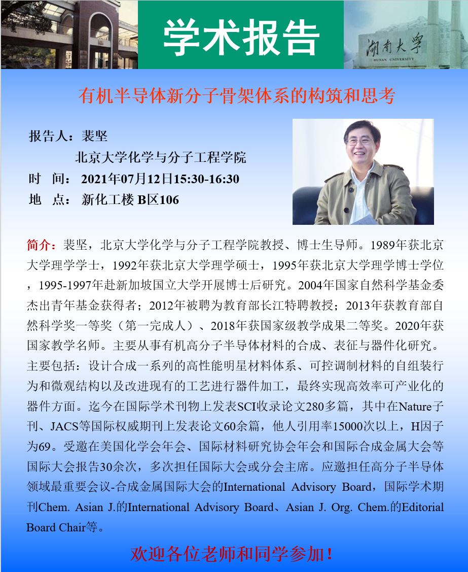學術地點 新化工樓B區106 主講人 裴堅 北京大學化學與分子工程學院