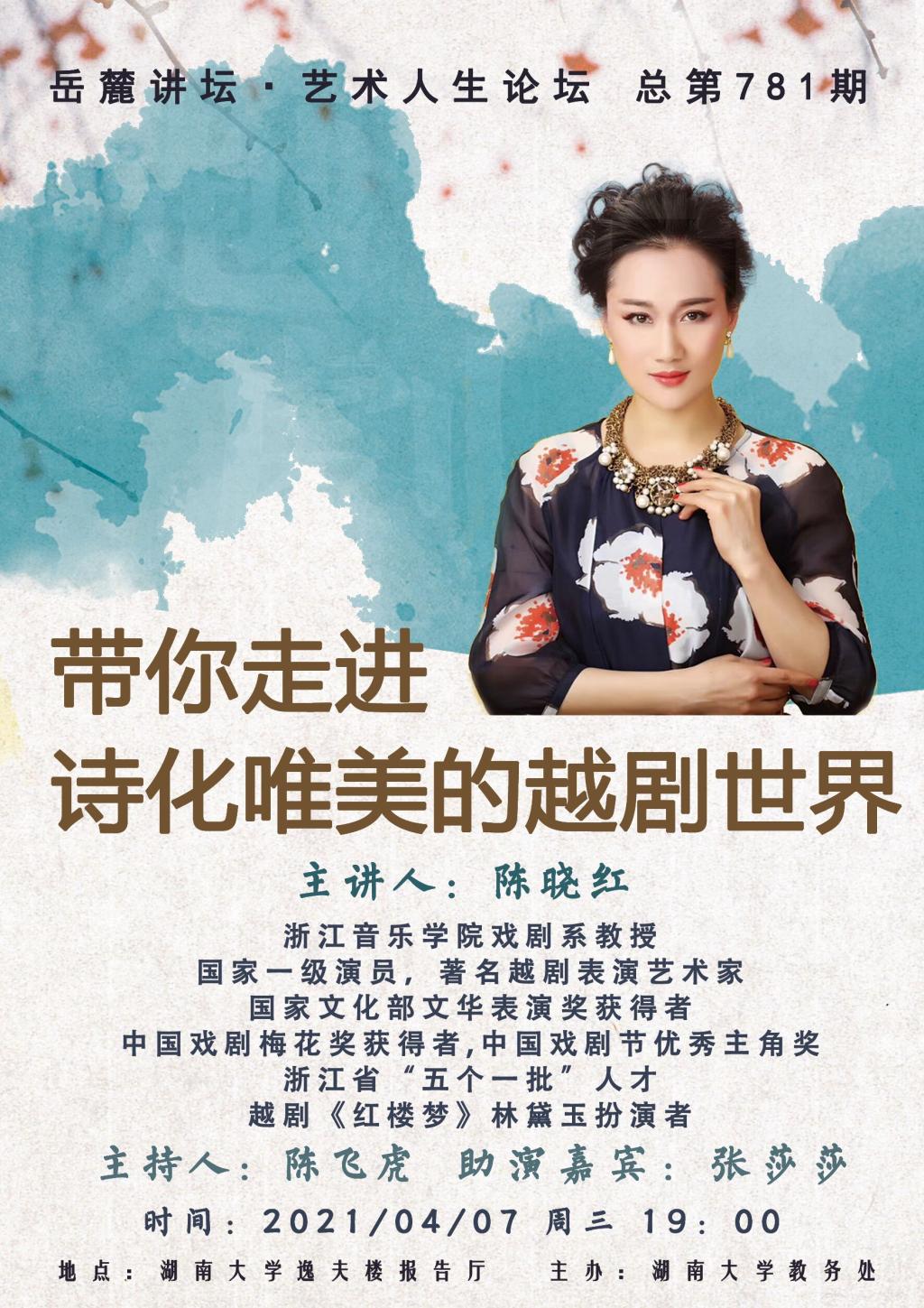 主講人:陳曉紅(浙江音樂學院戲劇系教授,國家一級演員,著名越劇表演藝術家,國家文化部文華表演獎獲得者,中國戲劇梅花獎獲得者,中國戲劇節優秀主角獎,浙江省“五個一批”人才,越劇《紅樓夢》林黛玉扮演者)