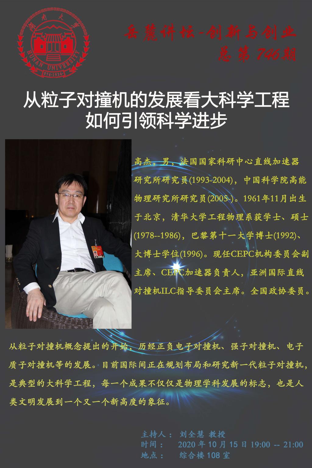 高杰,男,法國國家科研中心直線加速器研究所研究員(1993-2004),中國科學院高能物理研究所研究員(2005-)。1961年11月出生于北京,清華大學工程物理系獲學士、碩士 (1978--1986),巴黎第十一大學博士(1992)、大博士學位(1996)?,F(xiàn)任CEPC機構(gòu)委員會副主席、CEPC加速器負責人,亞洲國際直線對撞機ILC指導委員會主席。全國政協(xié)委員。